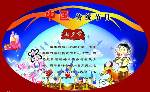 其起源于對(duì)自然的崇拜及婦女穿針乞巧,后被賦予了牛郎織女的傳說使其成為象征愛情的節(jié)日。現(xiàn)被認(rèn)為是“中國情人節(jié)”。