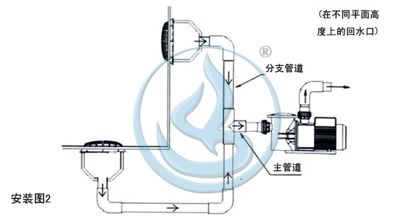 如果是面積較小的桑拿池,水療池等,可以在池底裝一個(gè),在池壁裝一個(gè)(如圖2)。注意不可同時(shí)堵住兩個(gè)防吸排水口。