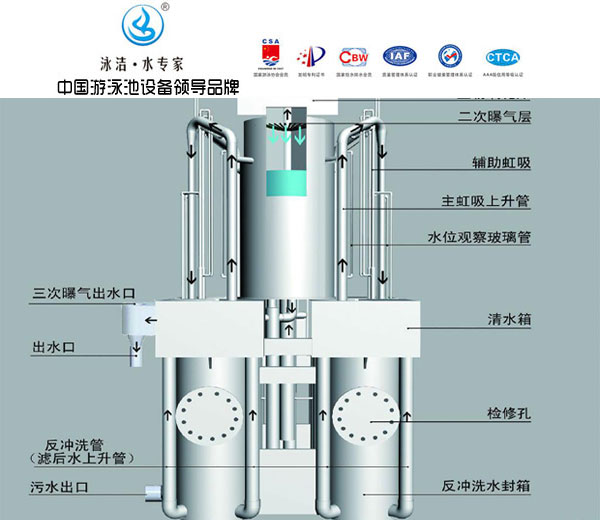泳池水過濾凈化工藝包括:“降低池水的渾濁度、提高池水的透明度、去除池水中膠狀或顆粒狀有機物、細菌和病毒”。保證游泳者的安全、衛(wèi)生,對池水進行過濾是不可缺少的。